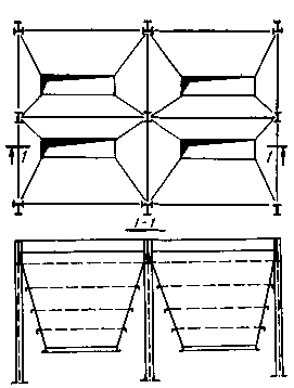 Рис. 2. Лотково-призматический бункер а - с пирамидальными воронками по всей площади днища; б - с местными воронками |