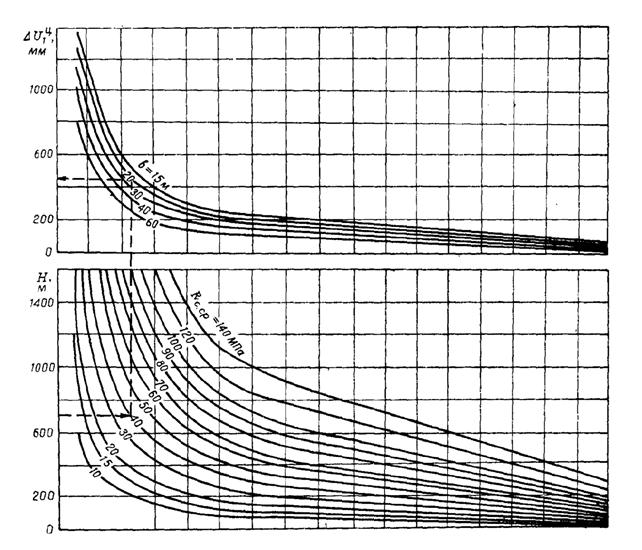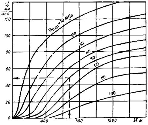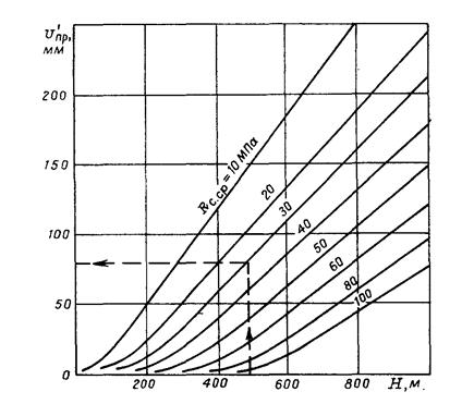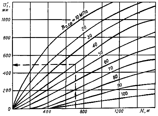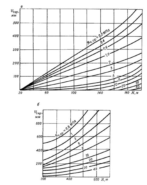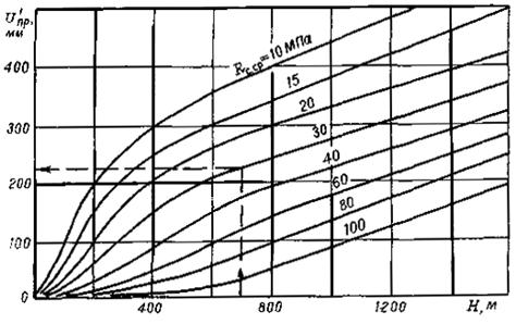 где Uт.кр, Uт.пч, Uт.б - смещения пород, определяемые по графикам (рис. 2) в зависимости от расчетного значения Rс пород кровли, почвы или каждого из боков и глубины расположения выработки Н**;