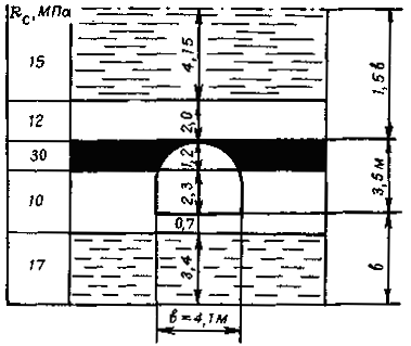 8. Расчетное сопротивление пород сжатию Rс определяют с учетом вмещающих выработку слоев (пластов), залегающих на расстояниях от контура сечения выработки в кровле 1,5b, в почве 1b (b - ширина выработки, м), а в боках при пологом и наклонном падении по высоте выработки, при крутонаклонном и крутом - на расстоянии 1b (рис. 1).