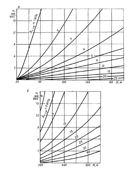 * Для горно-геологических и горно-технических условий, не учитываемых графиками U = f(Rс, H), оценивать смещения пород, скорости смещений пород и другие геомеханические параметры следует путем экстраполяции графиков по согласованию с ВНИМИ.