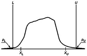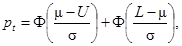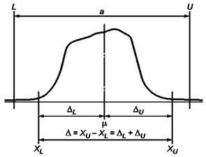 Нижняя (pL) и верхняя (рU) доли несоответствующих единиц продукции представляют собой площадь под плотностью распределения левее нижней и правее верхней границ поля допуска.