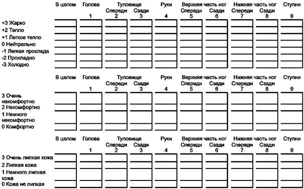 Ниже приведены шкалы температурной чувствительности, некомфортности, липкости и предпочтений.