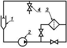 1 - гидробак (200 л); 2 - циркуляционный насос; 3 - фильтр для очистки; 4 - кран для отбора проб
