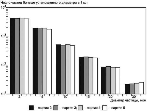 Для проведения высокоточных измерений стандартный образец должен быть как можно более однородным. Специальные усилия были предприняты для подтверждения того, что стандартный образец получен при наличии незначительных различий между бутылями в партии. Неодинаковость содержимого бутылей в партии может быть выражена через относительное стандартное отклонение результатов измерений для одной партии, приведенное в таблице 1. На рисунке 2 приведена гистограмма зависимости отсчетов частиц для четырех партий ISO MTD от диаметра частиц при проверке одинаковости содержимого в бутылях из разных партий. Гистограмма построена на основе средних интегральных отсчетов частиц для одного и того же объема анализируемой жидкости.