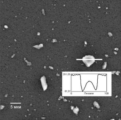 Анализ частиц проводился на исходных микрографических изображениях; и ни одна из особенностей частиц не была изменена или усилена. Пороговую яркость микроскопа настраивали визуально для каждого изображения, чтобы определить максимальную площадь частицы и не внести при анализе фоновые пиксели или ложные частицы. После настройки пороговой яркости изображения программа определяла число пикселей, составляющих частицы, т.е. их площадь. Отдельно анализировали изображение при каждом увеличении, охватывающем часть распределения частиц по размерам. Как видно, на рисунке 4 контуры частиц более яркие, чем их внутренние области. Результат сканирования частиц по пикселям вдоль наибольшего размера приведен на вставке к рисунку 4. Эта картина наблюдается на микрографических изображениях частиц, поскольку электроны рассеивающего пучка могут легко вылететь из контура частиц и быть обнаружены, а вероятность обнаружения электронов, проникающих в центральную часть частицы, мала [16]. Поскольку яркость контуров частиц почти всегда будет больше пороговой яркости, их считают частью частицы. Программа «заполняет» полые частицы, т.е. частицы, центральная часть которых отображена числом пикселей меньше порогового значения. Таким образом, важным этапом при определении точной площади частиц является идентификация их границ или контуров. Сложность заключается в том, что истинный контур частицы никогда не может быть определен с точностью большей, чем ширина пикселя. Определение контуров линейных микроструктур методом электронной микроскопии в метрологии подробно рассмотрено в работе [17]. Для сведения к минимуму неопределенности площади частиц должны быть отображены большим числом пикселей. Например при увеличении ´3300 сферическая частица размером 1 мкм будет отображена приблизительно 270 пикселями. При увеличении ´300 ту же самую частицу не анализируют, поскольку она будет отображена лишь двумя или тремя пикселями. Наименьшее число пикселей, используемое при анализе, составляет в большинстве случаев от 13 до 50.