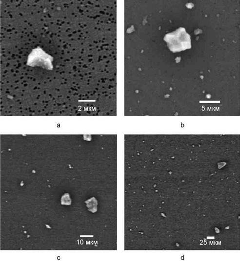 Перед рассмотрением отдельных частиц под микроскопом, их удаляли из гидравлической жидкости путем фильтрования. Вся аппаратура, связанная с проведением этих испытаний, была тщательно очищена деминерализованной водой, не содержащей твердых частиц (определяемых с помощью АСЧ), и ополоснута гептаном, предварительно отфильтрованным через мембранный фильтр номинальной тонкостью фильтрации 0,2 мкм. Отфильтрованный гептан использовали в качестве растворителя для удаления гидравлической жидкости с фильтра и промывки аппаратуры для фильтрования. Фильтрование проводили в чистом помещении класса чистоты 1001) для сведения к минимуму загрязнения твердыми частицами из окружающего воздуха. Для удаления частиц из гидравлической жидкости применяли поликарбонатные фильтры (диаметром 25 мм и номинальной тонкостью фильтрации 0,2 мкм). Эти фильтры обладают высокой эффективностью сбора частиц размером более 0,2 мкм и имеют гладкую плоскую поверхность, необходимую для рассмотрения под электронным микроскопом [18, 19].