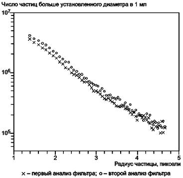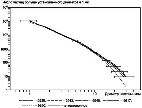 В NIST была разработана и применена экспериментальная методика определения одинаковости бутылей по содержимому, с помощью которой также могут быть обнаружены систематические погрешности приборов. В процессе изготовления одновременно заполнялось 4 бутыли (а, b, с, d). В каждой партии было 320 бутылей, и они были пронумерованы от 1 (а, b, с, d), 2 (а, b, с, d), ..., до 80 (а, b, с, d) по мере их изготовления. Из каждой партии отбирали контрольные бутыли для проверки их содержимого на одинаковость в независимой лаборатории и в NIST с использованием АСЧ, работающих на принципе ослабления света и калиброванных по ИСО 4402. Для первого набора отбирали контрольные бутыли (а, b, с, d), на четырех стадиях процесса изготовления, соответствующих заполнению приблизительно 5 %, 30 %, 60 % и 95 % общего числа бутылей в партии и анализировали их содержимое. Затем из этой же партии отбирали бутыли для второго набора на тех же стадиях процесса изготовления и анализировали их содержимое. Например содержимое 16 бутылей из первого набора с номерами 5а, 5b, 5c, 5d; 25 (а, b, с, d); 50 (а, b, с, d) и 75 (а, b, с, d), было проанализировано в указанном порядке. Затем содержимое бутылей из второго набора с номерами 6 (а, b, с, d), 26 (а, b, с, d), 51 (а, b, с ,d) и 76 (а, b, с, d), было проанализировано на том же самом калиброванном АСЧ. Для каждой бутыли анализ повторяли трижды, и таким образом было проведено 96 измерений. Каждую партию из 320 бутылей подвергали этой проверке или ее модифицированному варианту. Содержимое бутылей в партии считали одинаковым, если коэффициент отклонения числа частиц размером более 5, 7, 10, 20 и 30 мкм не превышал 4 %, 4 %, 4 %, 5 % и 7 % соответственно, если в партии не наблюдалось систематических отклонений. Было получено интегральное распределение частиц по размерам для номинального диапазона диаметров частиц от 1 до 80 мкм, и были сравнены результаты измерений для одной и той же партии бутылей с SRM 2806.
