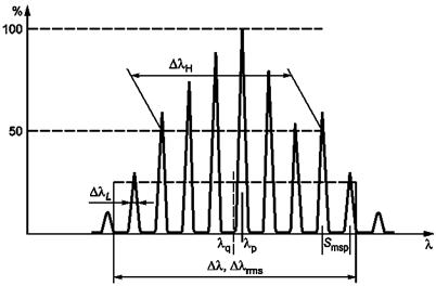 1 Обычно пределы суммы выбирают таким образом, чтобы относительные значения мощности в спектральных линиях или модах излучения вне этих пределов не превышали 1 % относительного значения мощности при длине волны lp.