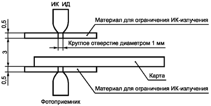 Испытуемую карту располагают между ИД и фотоприемником как можно ближе к фотоприемнику. В пределах зон карты, указанных в основном стандарте, регистрируют максимальное значение тока через фотоприемник Icard. Перемещают карту между ИД и фотоприемником для получения максимального тока.