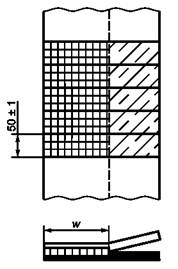 Испытание проводят на пяти образцах шириной (50 ± 1) мм, вырезанных из подготовленных пластин перпендикулярно к линии склеивания. Длина образцов должна быть такой, чтобы концы каждого образца целиком находились в зажимах и испытанию подвергался весь участок склеивания (см. рисунки 1 и 2).