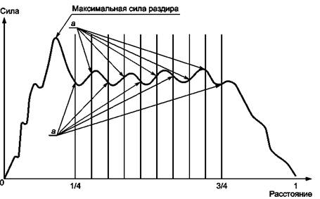 При расчете среднего значения сопротивления раздиру клеевого соединения отбрасывают первую и последнюю четверти данных, представленных на диаграмме, и вычисляют среднее значение силы растяжения в ньютонах образца шириной 50 мм (Н/50) как среднеарифметическое значение всех показателей силы в десяти равноотстоящих друг от друга точках на оставшемся участке (см. рисунок 3).