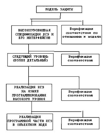 Дополнительно требуется, чтобы высокоуровневые спецификации КСЗ были отображены последовательно в спецификации одного или нескольких нижних уровней, вплоть до реализации высокоуровневой спецификации КСЗ на языке программирования высокого уровня. При этом методами верификации должно осуществляться доказательство соответствия каждого такого отображения спецификациям высокого (верхнего для данного отображения) уровня. Этот процесс может включать в себя как одно отображение (высокоуровневая спецификация - язык программирования), так и последовательность отображений в промежуточные спецификации с понижением уровня, вплоть до языка программирования. В результате верификации соответствия каждого уровня предыдущему должно достигаться соответствие реализации высокоуровневой спецификации КСЗ модели защиты, изображенной на чертеже (см. рис. Схема модели защиты).