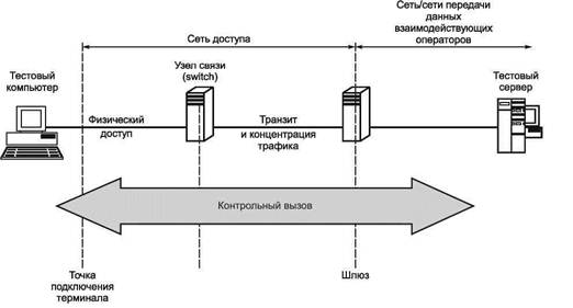 Б.1.3 Приведенная конфигурация основана на контрольных вызовах, при этом тестовый сервер должен быть приближен, насколько это возможно, к шлюзу, обеспечивающему взаимосвязь между сетью оператора связи, который оказывает услуги по установлению соединения, и сетью оператора, оказывающего телематические услуги. Этим достигается исключение влияния контрольных вызовов на сеть оператора, оказывающего телематические услуги. Показатели отразят только качество связи между абонентским терминалом и сервером доступа (тестовым сервером).