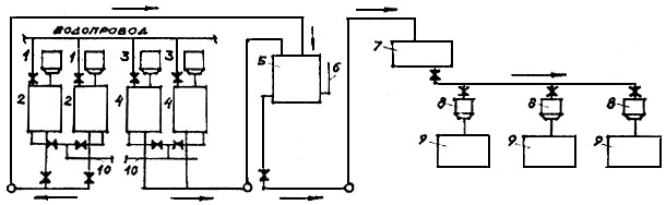 2 - кран; 3 - входной патрубок для подачи воды; 4 -