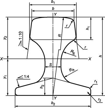 4.1 Форма и основные размеры поперечного сечения рельсов должны соответствовать приведенным на рисунках 1 и 2 и в таблице 1. Допускается изготовление рельсов других размеров и формы по чертежам, согласованным в установленном порядке.
