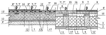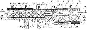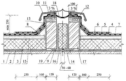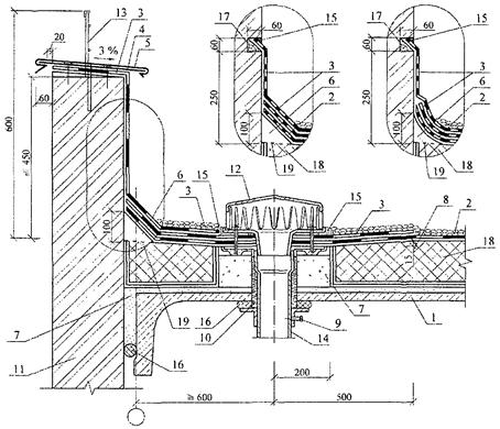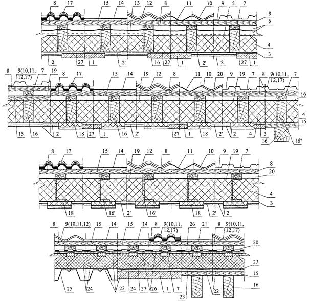 1 - несущая железобетонная плита; 2 - пароизоляция; 2¢ - битумный рулонный материал, прибитый к настилу; 3 - утеплитель; 4 - ветрозащитный слой (например, из стеклохолста, стеклоткани); 5 - двухканальный вентиляционный зазор; 6 - обрешетка; 6¢ - сплошной деревянный настил; 7 - кровля из меди или цинк-титана; 7¢ - кровля из оцинкованных листов 7" - кровля из алюминия; 8 - контробрешетка; 9 - объемная диффузионная мембрана; 9¢ - гидрозащитная пленка; 9" - структурный мат; 10 - стропило; 10¢ - стропило - термопрофиль из ЛСТК; 10" - стропило из ЛСТК; 11 - гипсокартон или плоский хризотилцементный лист; 11¢ - каркас под обшивку из гипсокартона или плоского хризотилцементного листа; 12 - приклейка битумом; 13 - теплоизоляция из пеностекла с коэффициентом паропроницаемости равным 0 (мг/м×ч×Па); 13 - теплоизоляция из пенополиуретановых плит с деревянными вкладышами; 14 - рулонный битумный материал; 15 - одноканальный вентиляционный зазор; 16 - ветрогидрозащитная пленка; 17 - выравнивающая затирка из цементно-песчаного раствора; 18 - металлическая зубчатая пластина 150´150 мм, приклеенная битумом; 19 - профилированный настил; 20 - дополнительная теплоизоляция; 21 - брусок |