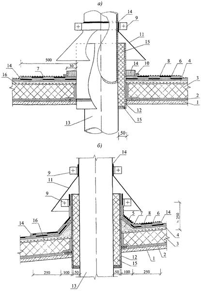Рисунок Н.9 - Коньковый узел (а) с вентиляцией через венттрубу и примыкание кровли к кирпичной трубе (б)