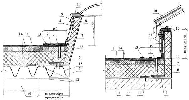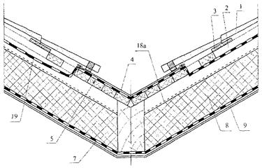 1 - металлочерепица; 2 - брусок; 3 - деревянный настил; 4 - контробрешетка; 5 - обрешетка; 6 - битумный самоклеящийся рулонный материал; 7 - металлическая деталь; 8 - дюбель; 9 - герметик; 10 - гипсокартон; 11 - пароизоляция; 12 - минвата (негорючая); 13 - теплоизоляция; 14 - брусок; 15 - крепление ветрогидрозащитной пленки двухсторонней липкой лентой; 16 - труба; 18 - ветро-гидроизоляционная пленка; 18а - ветрозащитный слой (из стеклохолста); 19 - гидрозащитная пленка