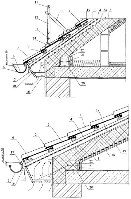 Примечания 1 Высота вентиляционного канала принята для длины ската не более 10 м; при большей длине ската высоту канала увеличивают на 10 % м либо дополнительно предусматривают установку вытяжных устройств (аэрационных патрубков). 2 Минимальный размер входных отверстий канала (на карнизном участке) - 200 см2/м. 3 Минимальный размер выходных отверстий канала (на коньке) - 100 см2/м. |