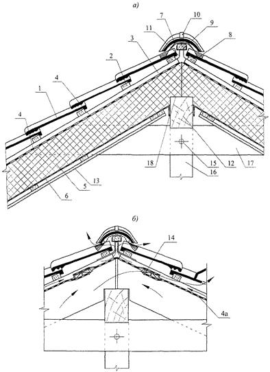 Рисунок П.2 - Коньковый узел кровли с вентиляцией через коньковый элемент (а) и через вытяжную трубу (б)