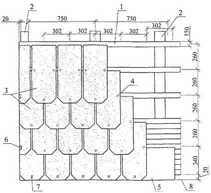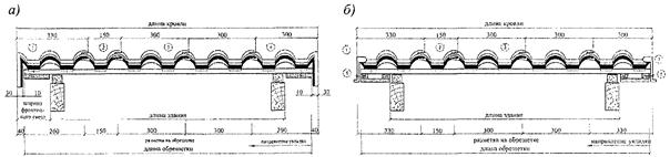 1 - обрешетка; 2 - стропило; 3 - плитка; 4 - крепежный элемент; 5 - краевая плитка; 6 - скоба для крепления свеса кровли; 7 - противоветровая кнопка; 8 - линия свеса