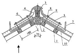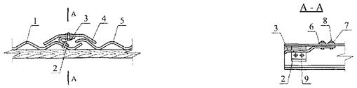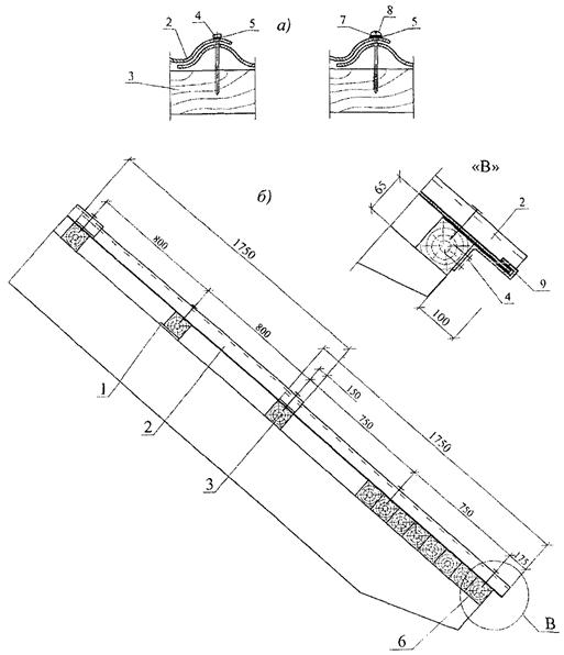 1 - накрываемый край волнистого листа; 2, 3 - скоба; 4 - лотковая деталь; 5 - край волнистого листа; 6, 7 - шайбы; 8 - винт с полукруглой головкой; 9 - заклепка