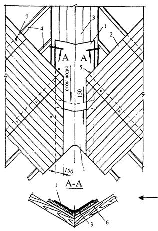 1 - лоток; 2 - листы; 3 - дощатый настил ендовы; 4 - брусок; 5 - шуруп; 6 - уравнительная планка; 7 - гвоздь