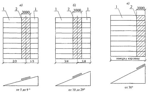 Рисунок С.3 - Зона расположения неподвижных (жестких) кляммеров на одну картину длиной не более 10 м в зависимости от уклона кровли