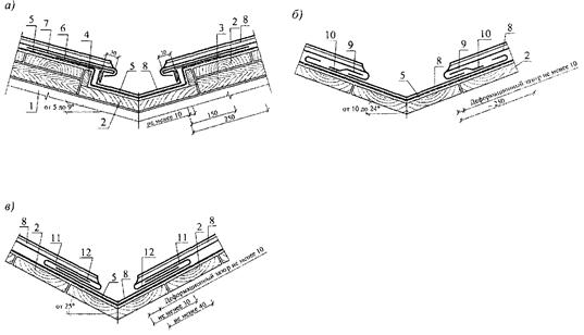 а - на кровлях с уклоном от 5 до 9° (9 - 16 %); б - на кровлях с уклоном от 10 до 24° (18 - 45 %); в - на кровлях с уклоном от 25° (47 %); 1 - стропило; 2 - обрешетка; 3 - доборный брус; 4 - доска; 5 - объемная диффузионная мембрана; 6 - костыль; 7 - металлическая полоса; 8 - кровля из металлических листов; 9 - фальшпланка; 10 - припой; 11 - загнутый край нижней картины; 12 - загнутый край верхней картины