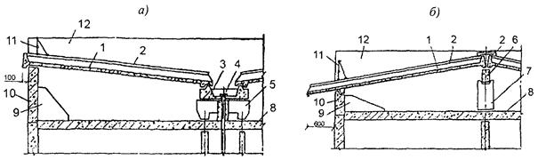 а - с внутренним водоотводом; б - с неорганизованным водоотводом; 1 - железобетонная кровельная панель; 2 - железобетонный П-образный нащельник; 3 - железобетонный водосборный лоток; 4 - водосточная воронка; 5 - подкладочная балка под лоток; 6 - опорная балка; 7 - опорный столик; 8 - утепленная панель перекрытия; 9 - треугольный анкерный элемент; 10 - опорная фризовая панель; 11 - ограждение крыши; 12 - торцовая фризовая панель