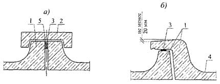 а - стык с перекрытием П-образным нащельником; б - стык внахлестку; 1 - кровельная панель; 2 - П-образный нащельник; 3 - герметик; 4 - основная водосливная поверхность кровельных панелей; 5 - уплотнитель