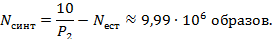 Предположим, что требуется тестировать вероятность ошибок второго рода Р2 = 10-6, заявленную некоторым производителем средства биометрической аутентификации. При этом мы имеем базу естественных биометрических образов «Чужой», состоящую из Nест = 10 000 образов. В соответствии с требованиями ГОСТ Р 52633.1 имеющиеся естественные биометрические образы необходимо дополнять искусственно синтезированными образами количеством: