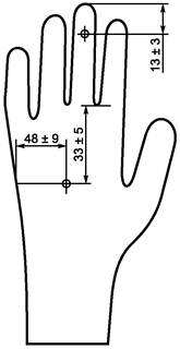 Толщину двух стенок неповрежденной перчатки измеряют в соответствии с требованиями ИСО 23529 толщиномером с давлением на основание, равным (22 ± 5) кПа, в каждой точке, указанной на рисунке 2: на расстоянии (13 ± 3) мм от вершины среднего пальца и точно в центре ладони. Толщина одной стенки в каждой точке, равная половине толщины двух стенок, должна соответствовать норме, приведенной в таблице 2, при уровне контроля и приемлемом уровне качества, указанных в таблице 1. Если при визуальном осмотре обнаруживают утонение в какой-либо области перчатки, то измеряют толщину одной стенки перчатки в этой области.