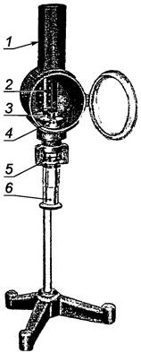 1 - вытяжная труба; 2 - шкала; 3 - направляющая фитиля; 4 - камера; 5 - втулка для резервуара; 6 - резервуар