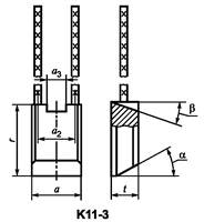 К11-4 - щетка со скошенной контактной поверхностью, скошенным пазом на верхней поверхности и одним проводом на меньшей боковой грани;