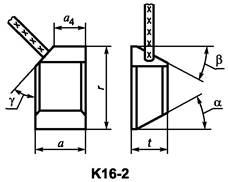 К16-2 - щетка со скошенной контактной поверхностью, двумя скосами на верхней поверхности и одним токоведущим проводом на скосе;