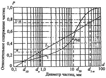 1 - график суммарного относительного содержания (обеспеченности) частиц в грунте (кривая зернового состава грунта); 2 - вспомогательный график для определения расчетных размеров частиц по В.Н. Кондратьеву.