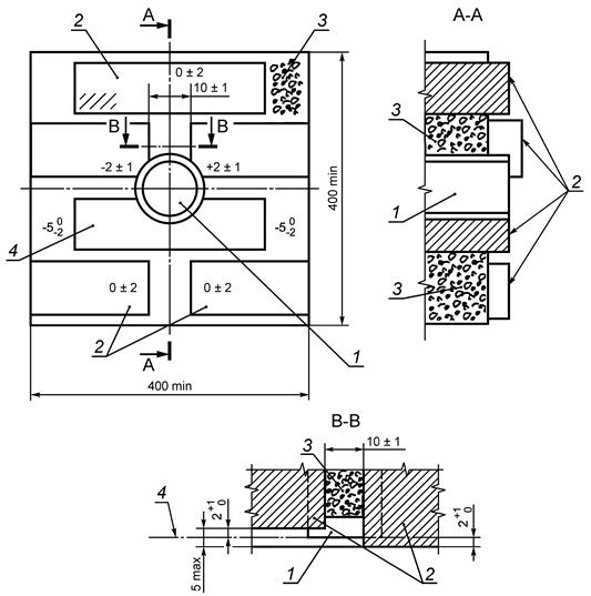 1 - падающий груз (100 ± 1) г; 2 - промежуточная деталь из стали массой 100 г; 3 - немного закругленные края; 4 - образец; 5 - плита из стали массой (10 ± 1) кг