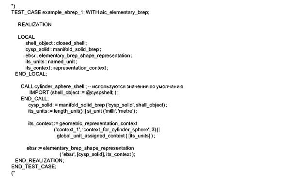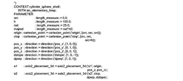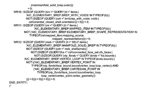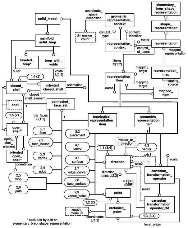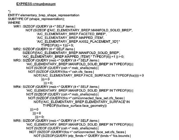 - определение объекта elementary_brep_shape_representation, являющегося представлением, образованным одним или несколькими объектами manifold_solid_brep, каждый из которых определен элементарной геометрией и полностью явной топологией;