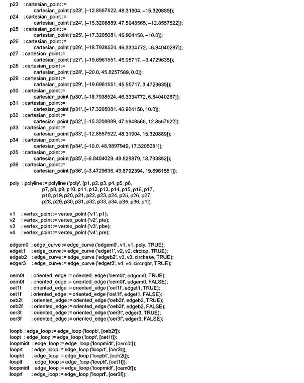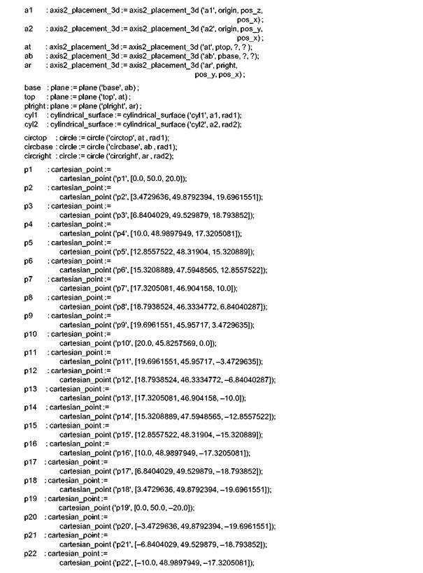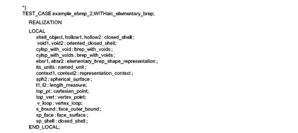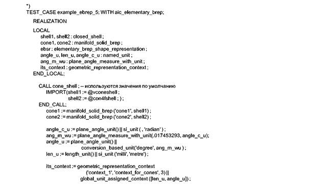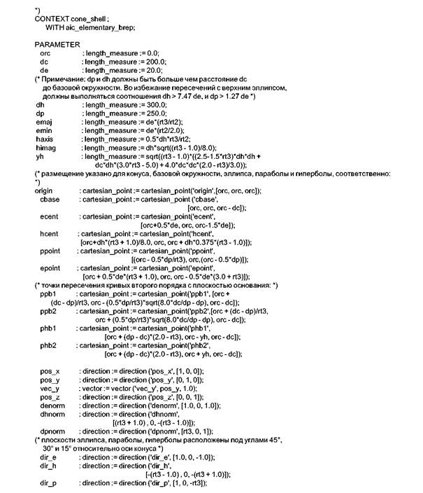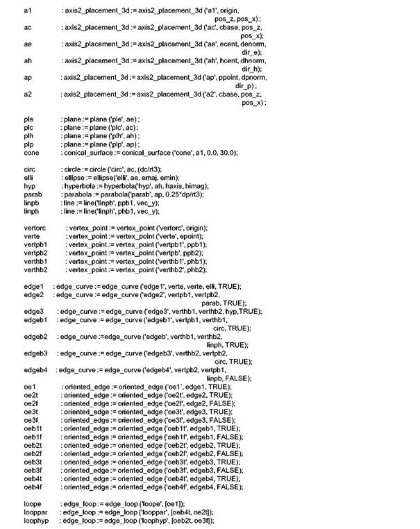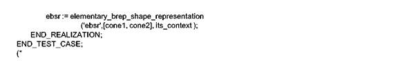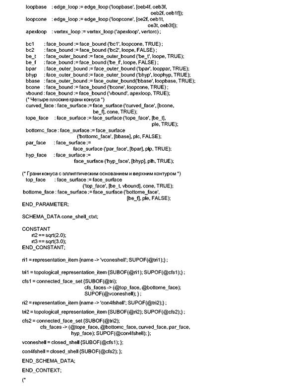 Создается объект elementary_brep_shape_representation, состоящий из двух объектов manifold_solid_brep. Объекты manifold_solid_brep должны иметь форму конусов, ограниченных наклонными плоскостями. Плоскости выбираются так, чтобы линии пересечения имели форму эллипса, параболы, гиперболы и дуг окружности. Первый конус имеет вершину, образованную объектом vertex_loop, и эллиптическое основание. У второго конуса вершина образована эллиптической кривой, как и его основание. Соответствующее множество размеров определено в приведенной ниже спецификации на языке EXPRESS-I.
