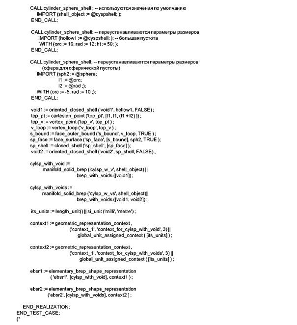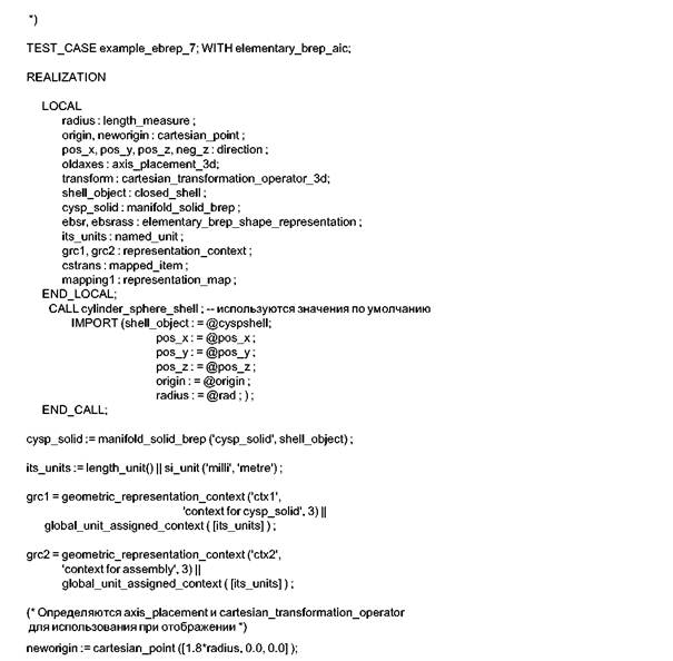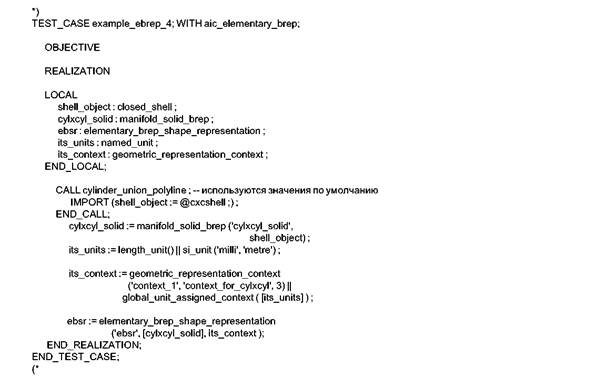 Создается объект elementary_brep_shape_representation, состоящий из единственного объекта manifold_solid_brep. Объект manifold_solid_brep должен иметь форму двух перпендикулярных пересекающихся цилиндров. Для определения положения одного из этих цилиндров при определении объекта axis2_placement_3d должны быть использованы параметры, заданные по умолчанию. Линия пересечения должна быть представлена полилинией. Соответствующее множество размеров определено в приведенной ниже спецификации на языке EXPRESS-I.