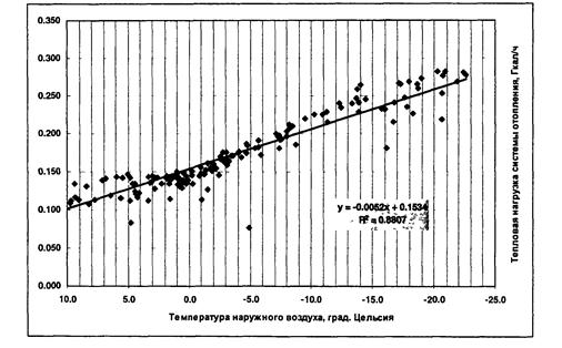Рисунок П1.2. Обработка данных с определением функций тепловой нагрузки системы отопления от температуры наружного воздуха (качество регулирования и теплозащиты)