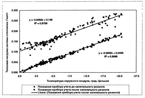 В составе этой документации были приложены данные о потреблении тепла на цели отопления по приборам учета тепловой энергии, обработанные и представленные в соответствии с требованиями настоящей методики, в том числе показания приборов технического учета потребления тепла на отопление в зависимости от температуры наружного воздуха до проведения капитального ремонта и показания приборов технического учета потребления тепла на отопление после его завершения.