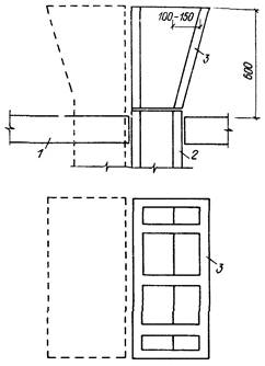 2.5. На вентблоках, выходящих на теплый чердак, следует устанавливать оголовки в форме диффузоров с расширением по сравнению с вентиляционным блоком на 100 - 150 мм. Высоту оголовка рекомендуется принимать 600 мм (рис. 1). Отверстия в нижней части оголовка вентблока должны соответствовать размерам поэтажных блоков.