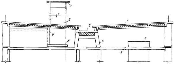 1 - комплексная панель покрытия из разноплотного керамзитогазобетона; 2 - опорная балка; 3 - опорная рама; 4 - диффузор вентиляционного блока; 5 - самонесущая стеновая панель; 6, 7 - опорные элементы; 8 - навесная стеновая панель; 9 - водосборный коллектор; 10 - вытяжная шахта