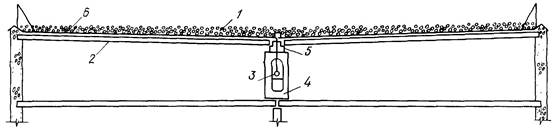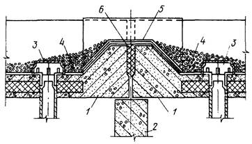 1 - слой утеплителя из керамзитового гравия; 2 - кровельная панель; 3 - водосточный коллектор; 4 - опора; 5 - прогон; 6 - рулонный ковер «насухо»