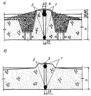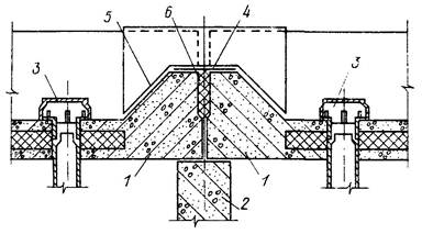 3.6. Плита должна иметь ровную нижнюю поверхность и уклоны на верхней плоскости, отводящие воду к воронке, расположенной у внутренней торцевой грани (рис. 6). По торцам стыкуемых граней панелей имеются водоотводящие желоба. Торцовые бортики стыкуемых панелей заделываются уплотняющими прокладками дважды по высоте шва с нанесением герметизирующей мастики на верхнюю прокладку. На стыкуемые бортики укладывается полоса гидроизоляционного материала (гидробутил, кровлелон, армокровлелон) с последующей засыпкой желобов гравием или фракционированием щебнем (d £ 30 мм).