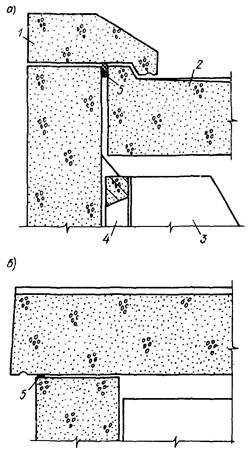 а - с торцевой; б - с продольной; 1 - карнизный блок; 2 - панель покрытия; 3 - элемент жесткости; 4 - опорная балка; 5 - герметизирующая прокладка