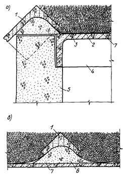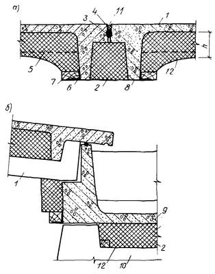 а - стык панелей покрытия; б - сопряжение кровельной панели с лотком; 1 - панель покрытия; 2 - теплопакет; 3 - упругая прокладка; 4 - нетвердеющая мастика; 5 - эффективный утеплитель; 6 - уголок; 7 - деревянный брусок; 8 - гидроизоляция (рулонная); 9 - лоток; 10 - опора; 11 - защитная окраска; 12 - пароизоляция (раствор безосновного линолеума в бензине или керосине)