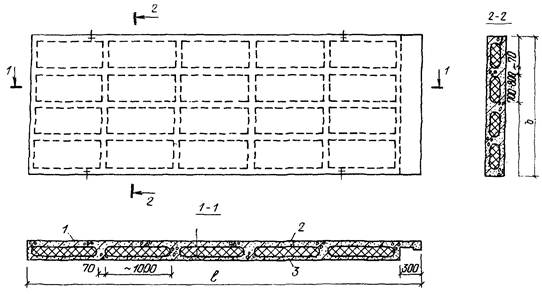 Для придания плитам кровли несущей способности, а также для повышения плотности и водонепроницаемости верхний слой плиты толщиной 40 - 60 мм и ребро имеют марку В-15 с плотностью 1100 кг/м3 и водонепроницаемостью не менее W-8. Этот слой обладает также повышенной морозостойкостью (F 300 - 500), марка которой определяется видом использованного заполнителя. Получение упрочненного слоя бетона осуществляется путем ограничения вспучивания смеси при формировании изделия по технологии «лицом вниз». Нижний слой панели, выполняющий теплозащитные функции, имеет марку М 50 и обладает малой паропроницаемостью и теплопроводностью.
